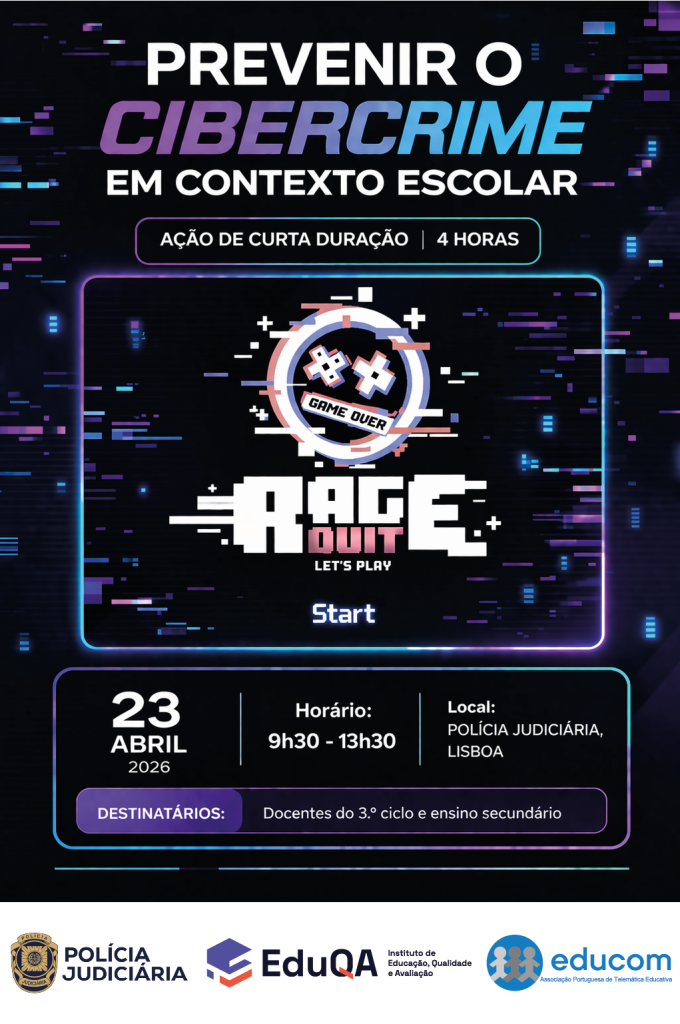 O Centro de Formação da EDUCOM, em parceria com o Instituto de Educação, Qualidade e Inovação (EduQA) e a Unidade Nacional de Combate ao Cibercrime e à Criminalidade Tecnológica (UNC3T) da Polícia Judiciária, promove no próximo dia 23 de abril de 2026, em Lisboa, a Ação de Formação de Curta Duração (AFCD) “Prevenir o Cibercrime em Contexto Escolar”.